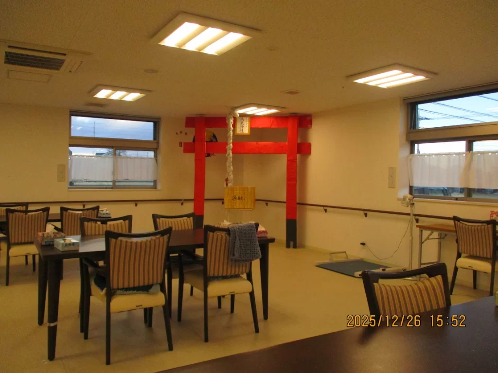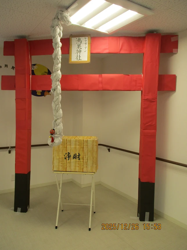 玄関には、職員が手作りした門松や凧でお出迎えし、食堂には神社の鳥居が設置され、利用者様も大喜びです!