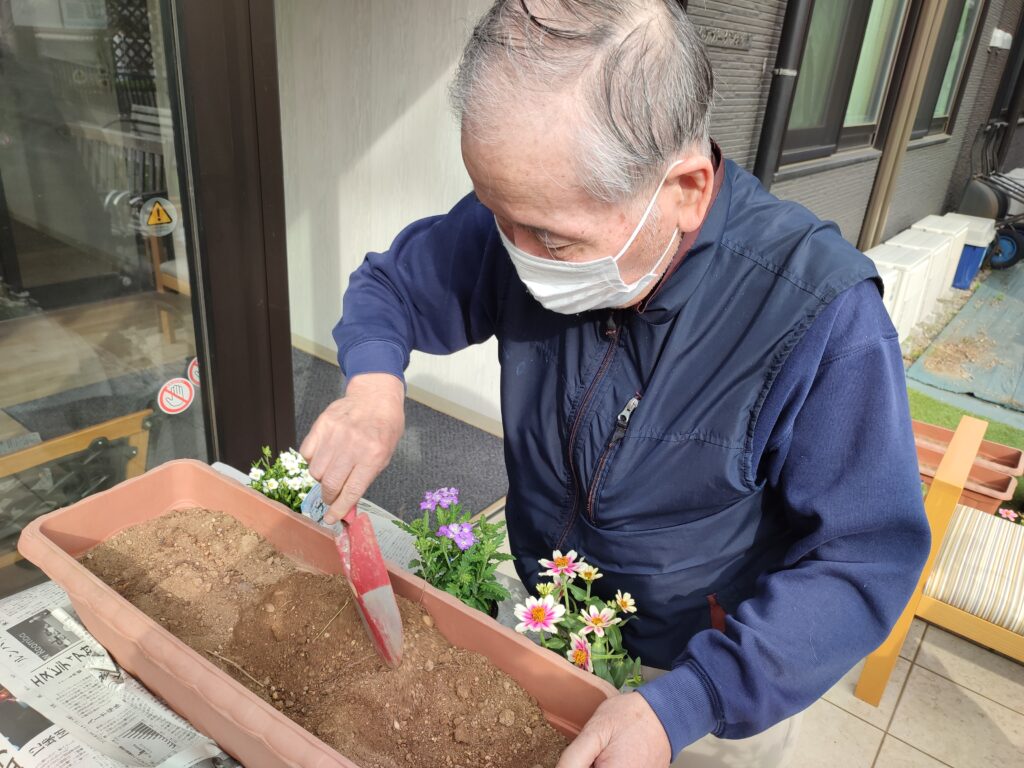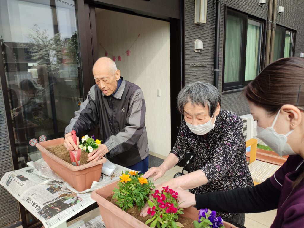 春なので、入居者様と一緒にプランターにお花を植えました。色とりどりのお花を3つ選んでいただき植え付けていただきました。入居者様みなさんセンスが良くきれいに仕上がりました🌸