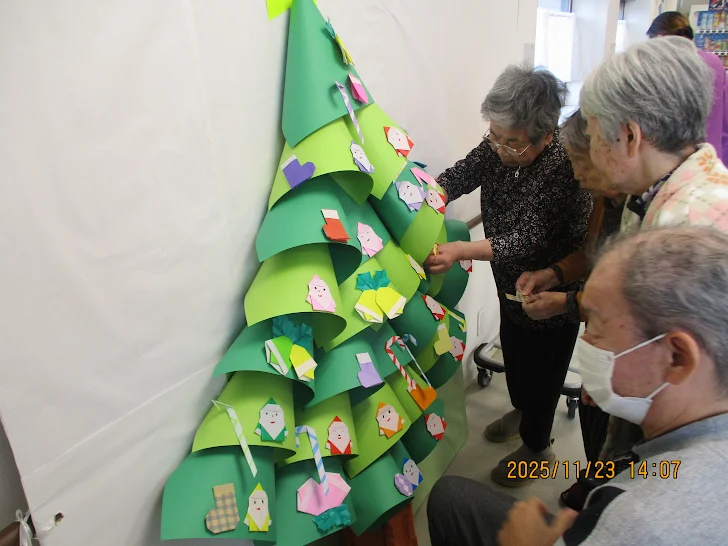 皆様一緒にクリスマスツリーの飾りつけと、そしてもう一つは手作りのクリスマスツリーを飾りました。