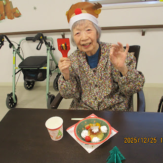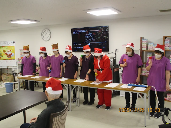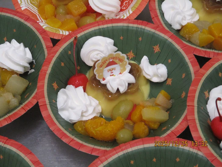 今年は、クリスマスケーキの代わりにプリンを使ったデザートを職員みんなで手作りし、利用者の皆様にご提供しました。そして、職員によるハンドベルの演奏を聴いて頂き、利用者様も一緒に参加して頂き、楽しいクリスマス会になりました。皆様、美味しいと完食でとても喜んでくださいました。楽しいクリスマスの時間を過ごすことが出来ました。