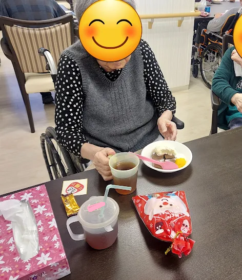 お食事と同時にスイーツが配られ、早くもプレゼントのお菓子もスイーツも完食されたご入居者様笑顔が素敵でした。