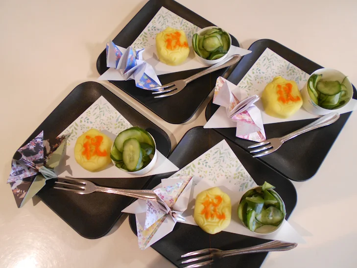 おいしい練り切りやきゅうりのお漬物を召し上がっていただき